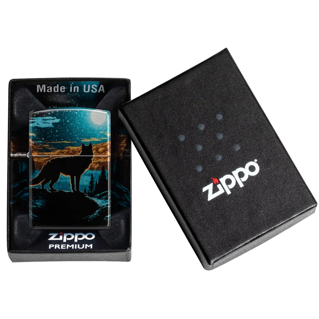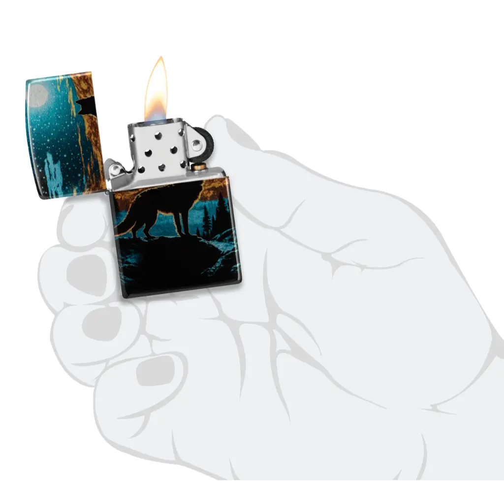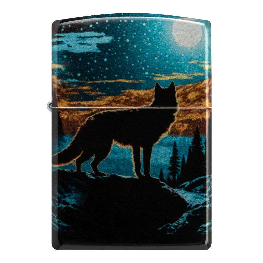 Usamljeni vuk promatra krajolik obasjan mjesečinom na ovom klasičnom upaljaču Tumbled Chrome u blistavom dizajnu 540 Fusion. Dolazi pakiran u poklon kutiji.